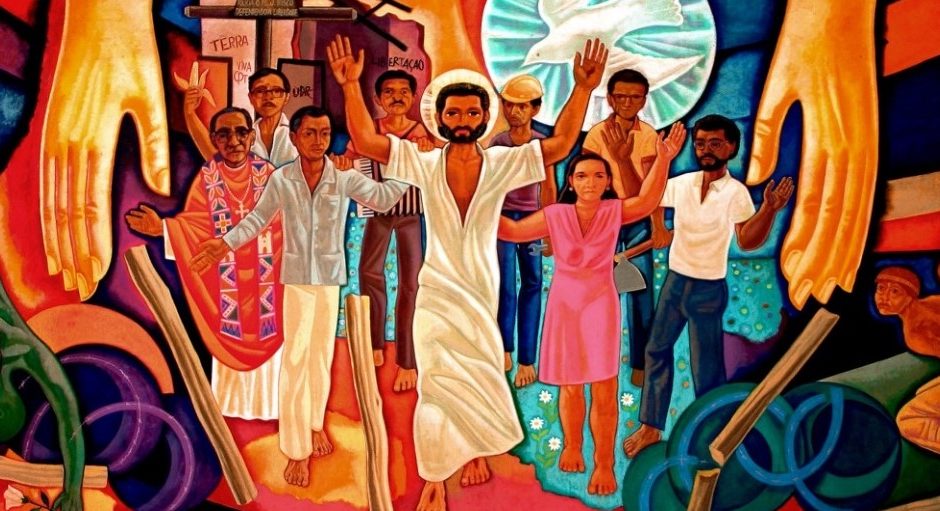 Este mural pintado por Maximino Cerezo Barredo (1932-2005), conhecido como “o pintor da libertação”, retrata o Corpo de Cristo ressuscitado junto dos mártires da defesa da vida, pela força do amor do Abba querido e do Sopro de Amor, Divino Espírito Santo.